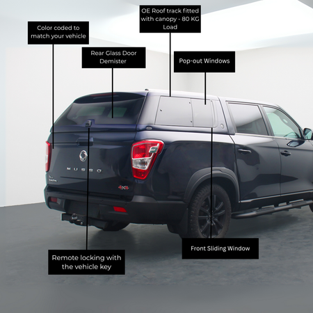 SsangYong Musso 2018+ ARG SWB Canopy β Pop-Out Side Windows, Front Sliding Window, Roof Track 80kg, Rear Demister, Remote Central Locking, Factory Colour-Matched Finish β All Features Included β Elysium Premium